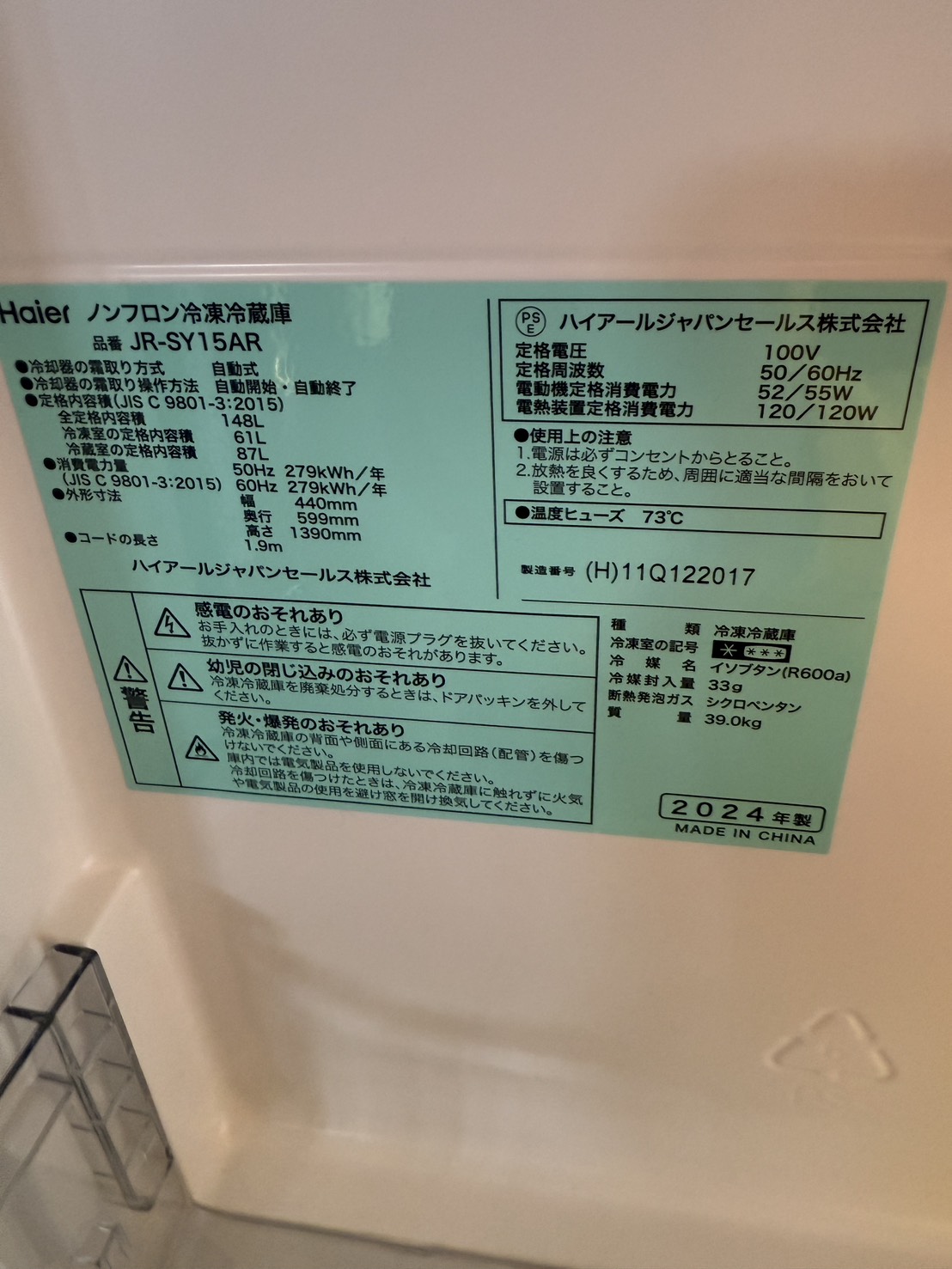 ハイアール 冷蔵庫 148L JR-SY15AR 2024年製