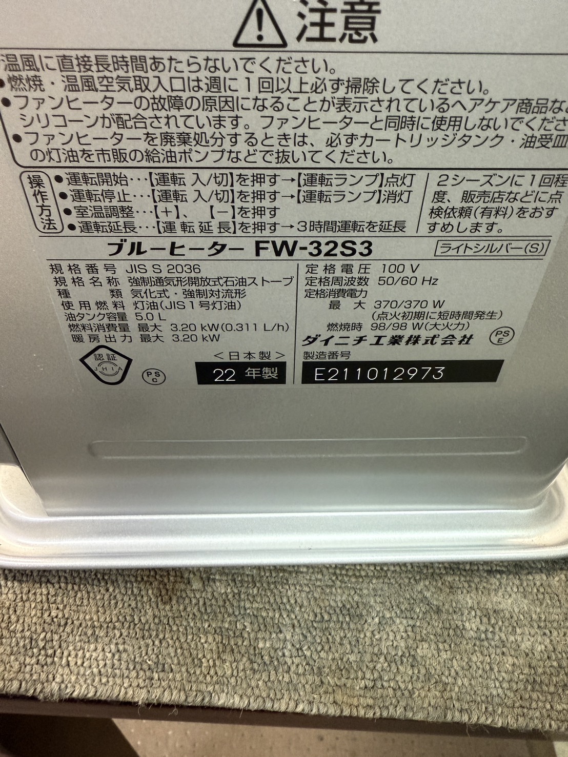 ファンヒーター 暖房出力:3.20kw 油タンク容量:5.0ℓ  2022年製
