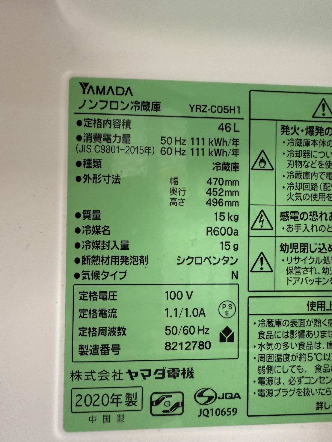 ヤマダ電機 冷蔵庫 46L YRZ-CO5H1 2020年製 #1883