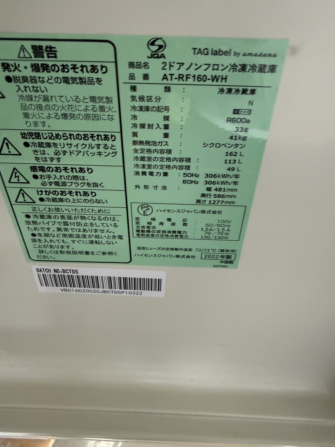 ハイセンス 冷蔵庫 162L AT-RF160-WH 2022年製 #1887