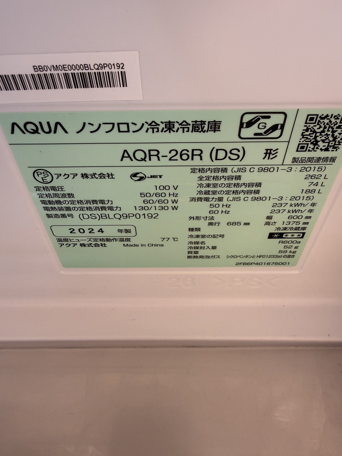 アクア 冷蔵庫 262L AQR-26R(DS) 2024年製 #1920