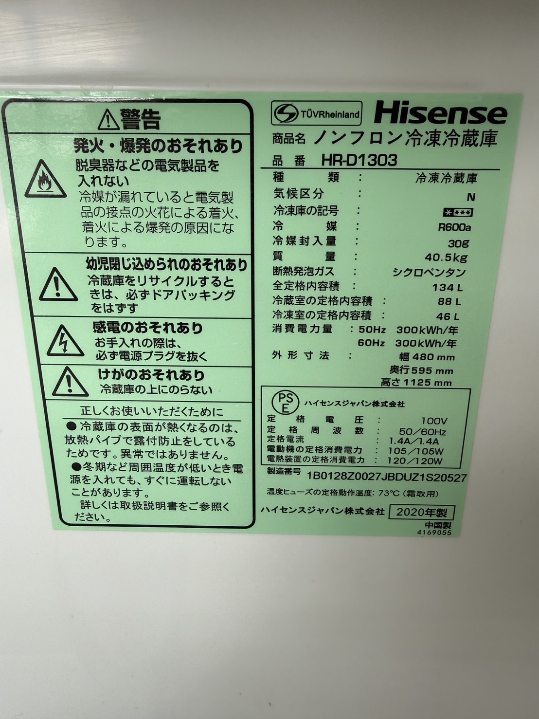 ハイセンス 冷蔵庫 HR-D1303 134L 2020年製  #1925