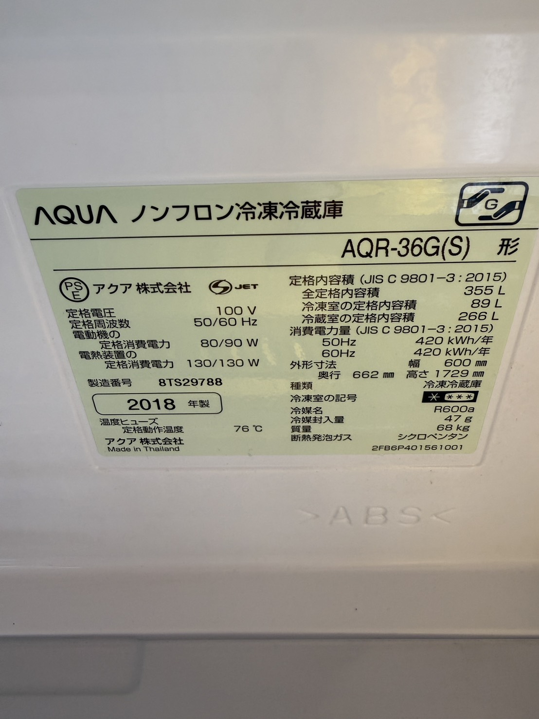 アクア 冷蔵庫 355L AQR-36G 2018年製  #1969