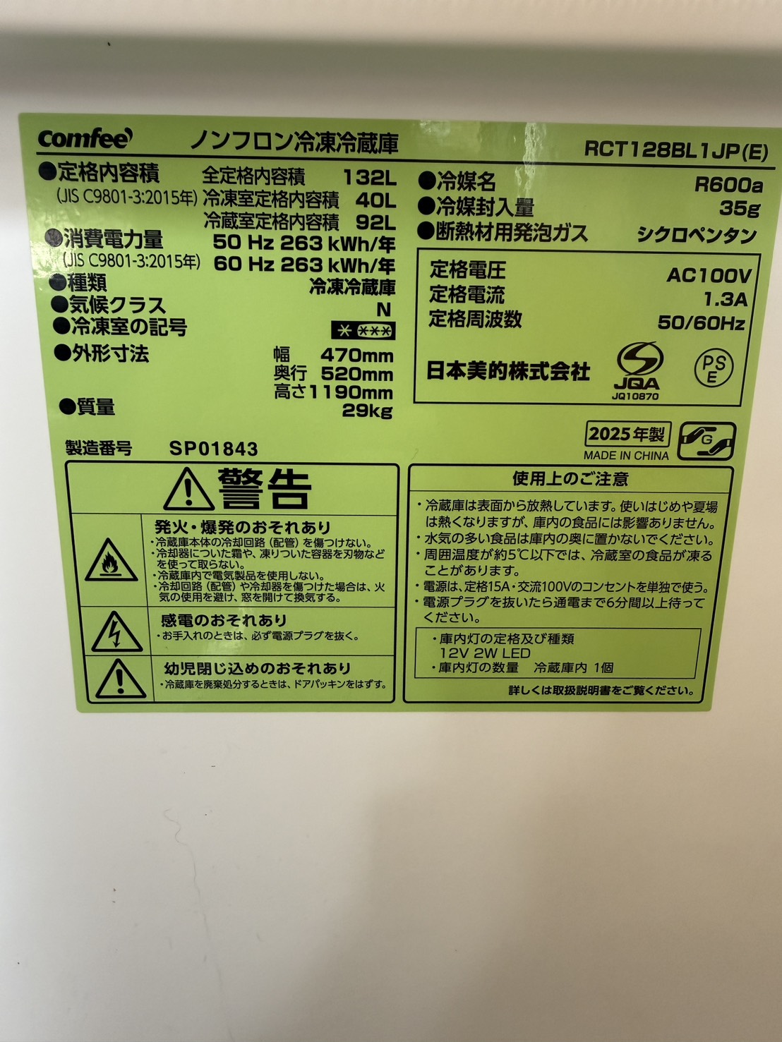 Comfee 冷蔵庫 132L RCT1288L1JP 2023年製 #1971