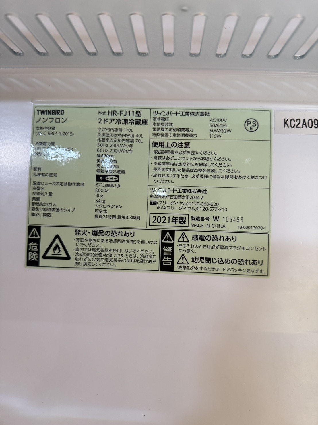 TWINBIRD 冷蔵庫 110L HR-FJ11 2021年製 #1973