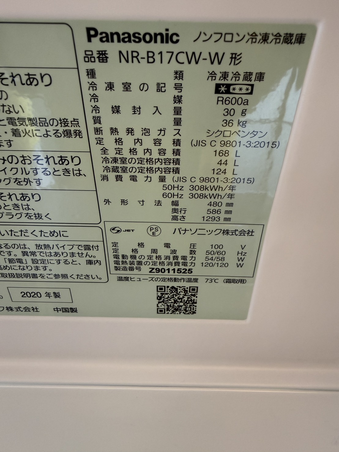 パナソニック 冷蔵庫 168L NR-B17CW-W 2020年製 ※野菜ケースに薄いキズあり #1976