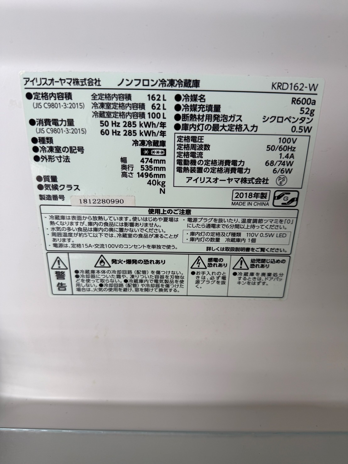 アイリスオーヤマ 冷蔵庫 162ℓ 2018年製 KRD162-W