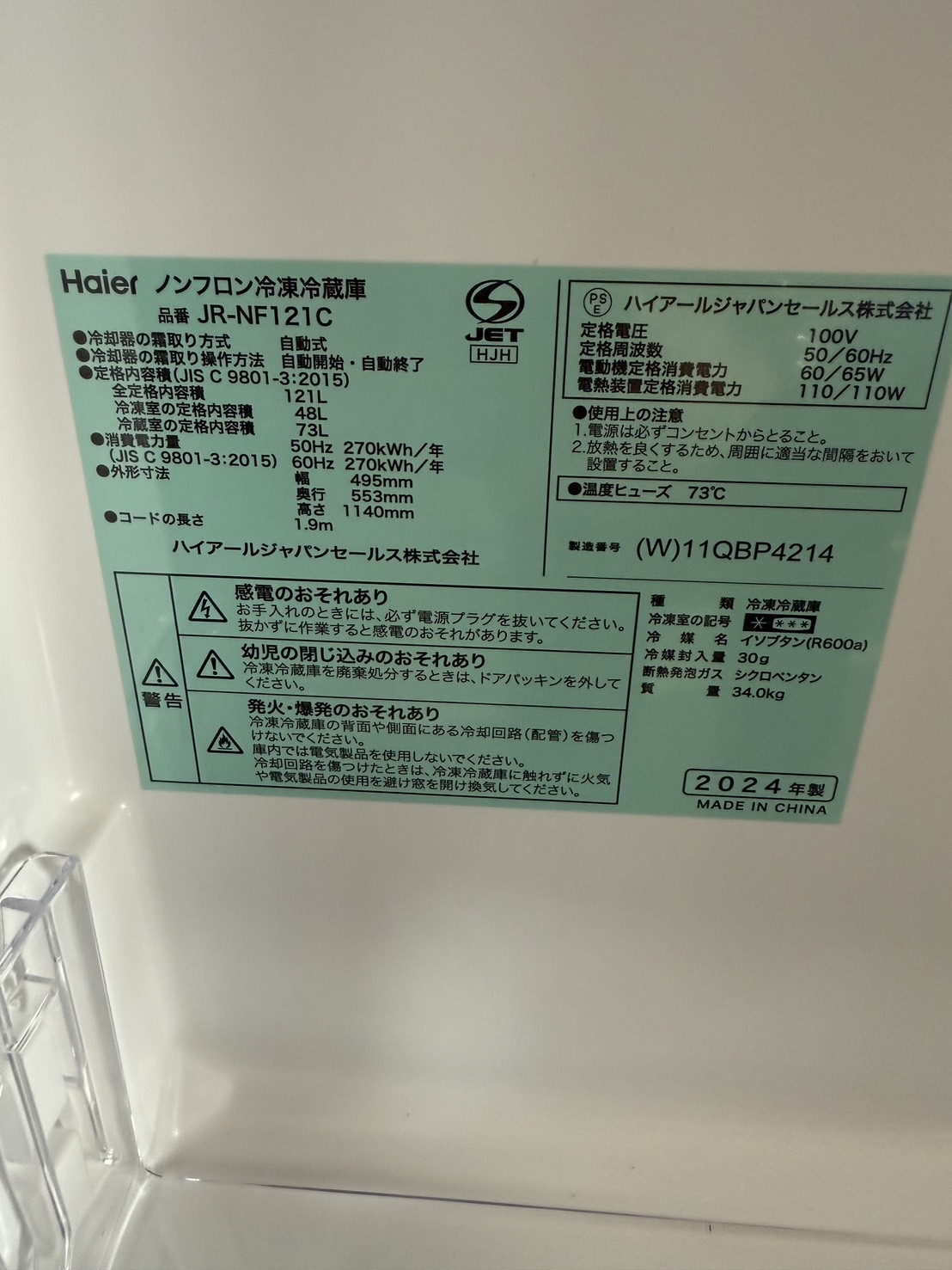 ハイアール 冷蔵庫 JR-NF121C 2024年製 定価14800円