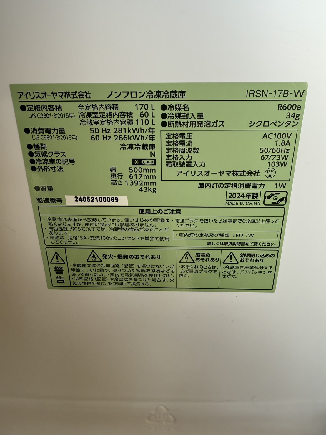 アイリスオーヤマ 冷蔵庫 170L IRSN-17B-W 2024年製 #1800