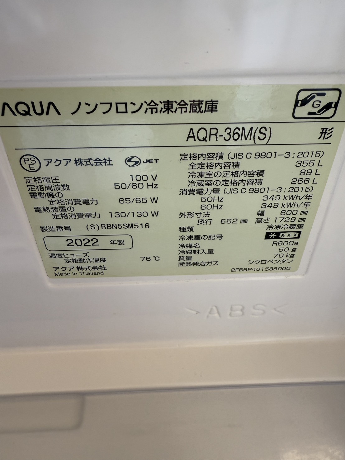 アクア 冷蔵庫 355L AQR-36M 2022年製