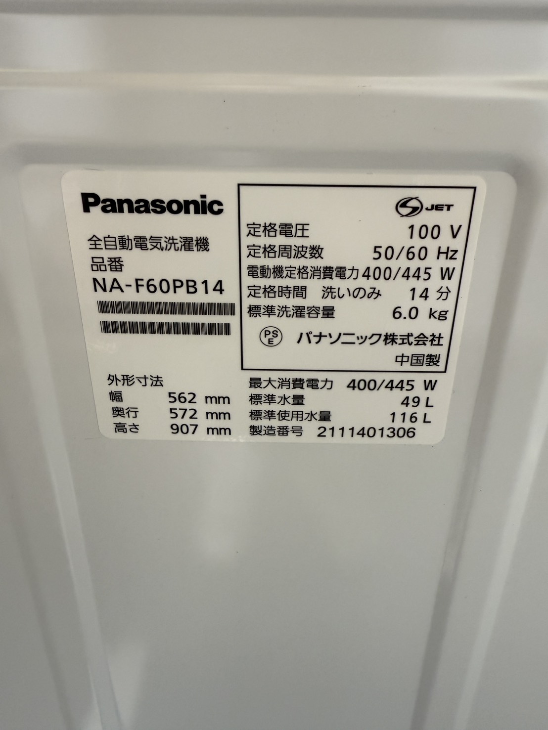 パナソニック 洗濯機 NA-F60PB14 2021年製