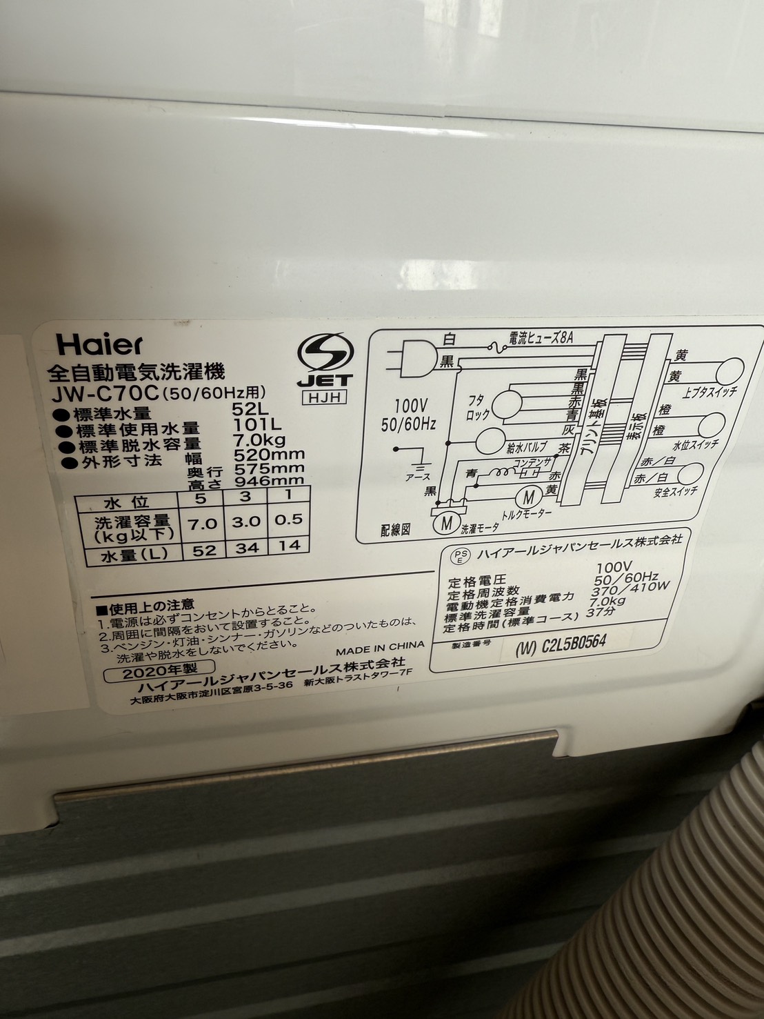 ハイアール 洗濯機 7.0㎏ JW-C55FK 2020年製 #1807