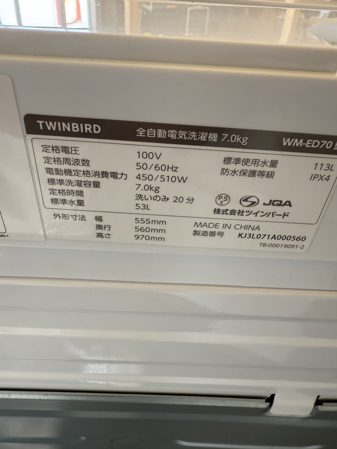 TWINBIRD 洗濯機 7.0㎏ KM-ED70 2023年製 #1814