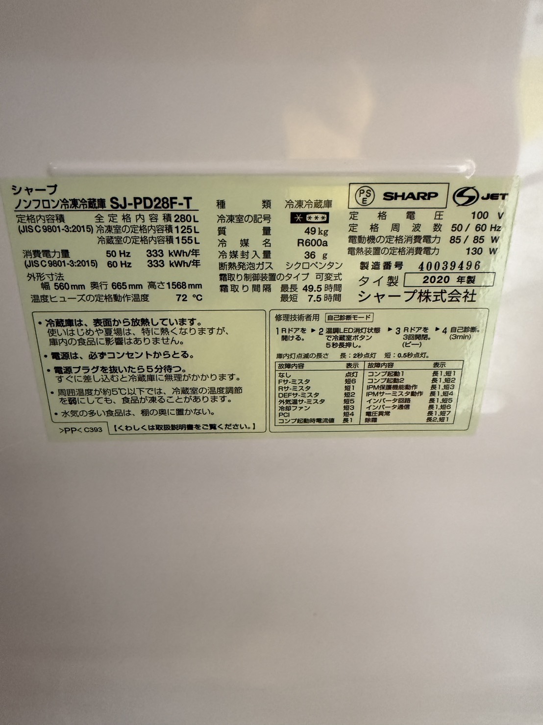 SHARP 冷蔵庫 280L SJ-PD28F-T 2020年製 #1818