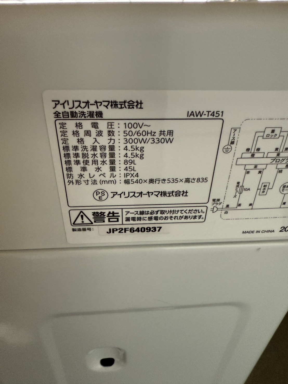 アイリスオーヤマ 洗濯機 4.5㎏ IAW-T451 2024年製 定価14800円