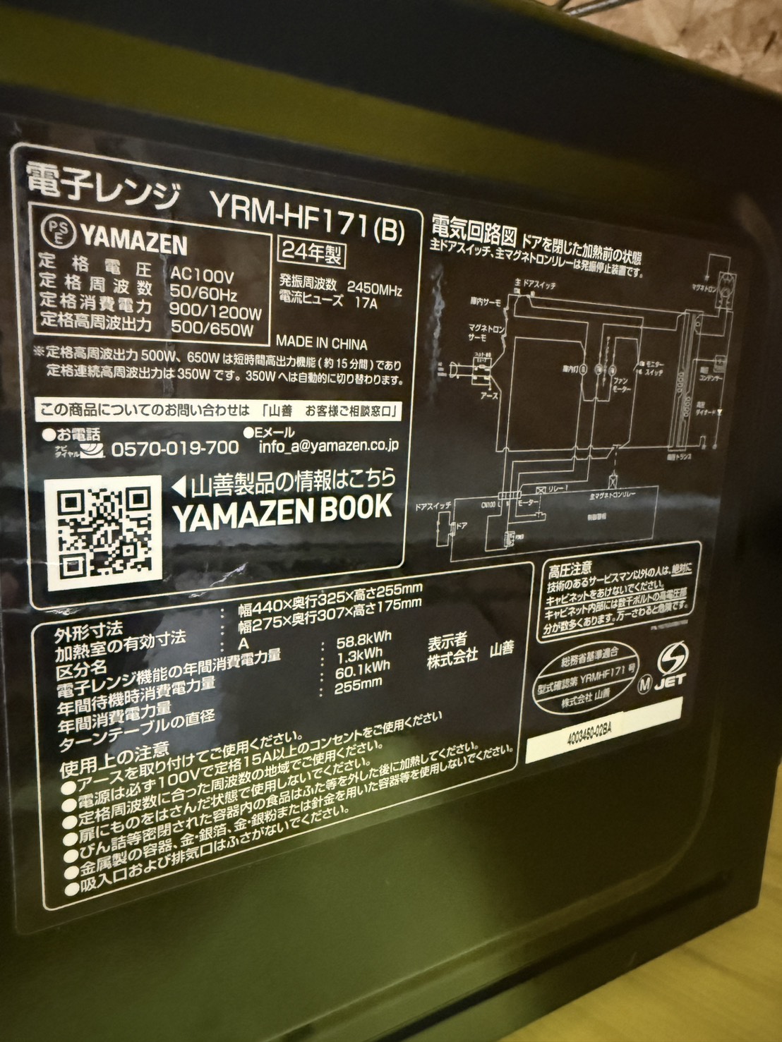 YAMAZEN 電子レンジ 650W YRM-HF171 2024年製 #1836