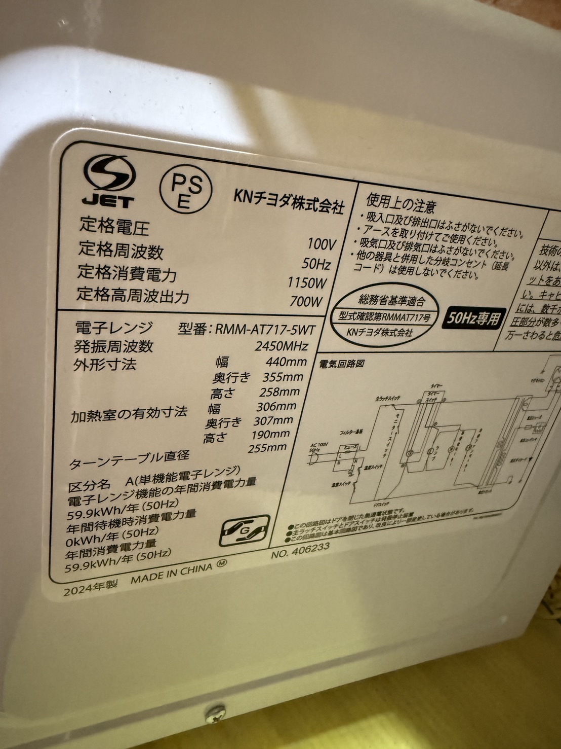 チヨダ 電子レンジ RMM-AT717-5WT 2024年製 #1838
