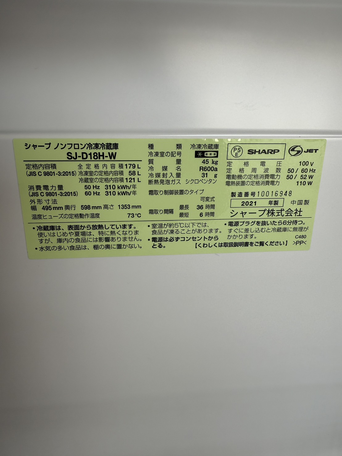SHARP 冷蔵庫 179L SJ-D18H 2021年製
