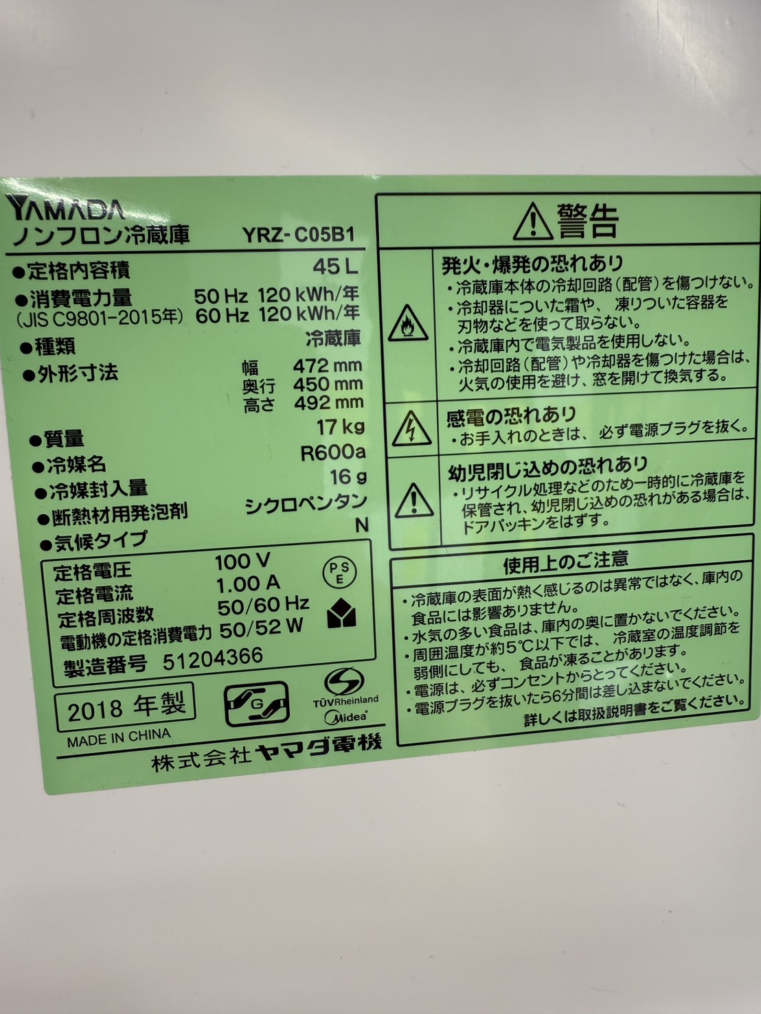 ヤマダ電機 冷蔵庫 45L YRZ-C05B1 2018年製 #1846