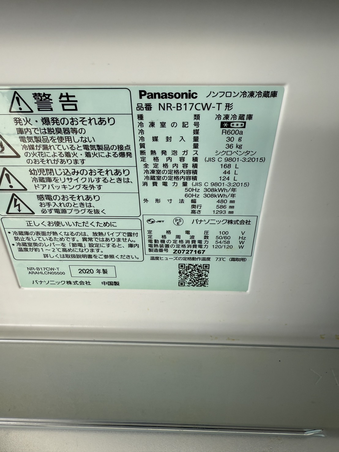 パナソニック 冷蔵庫 168L NR-B17CW-T 2020年製 #1852