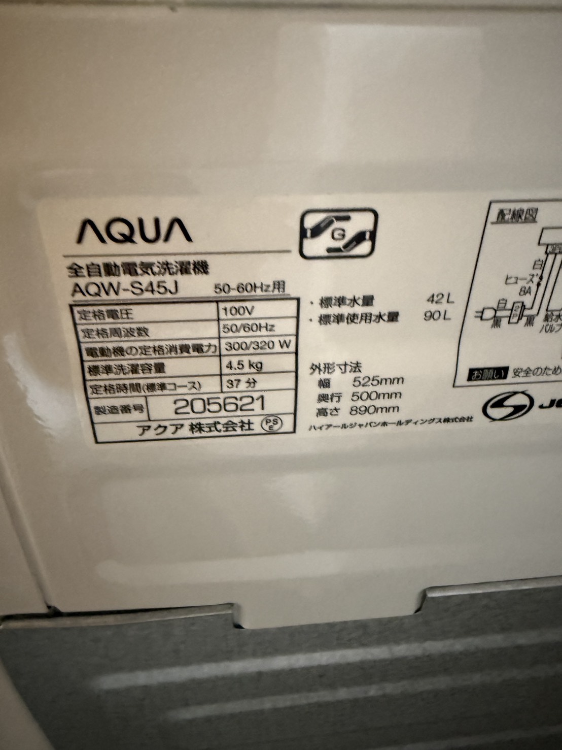 アクア 洗濯機 4.5㎏ AQW-S45J 2021年製 #1861