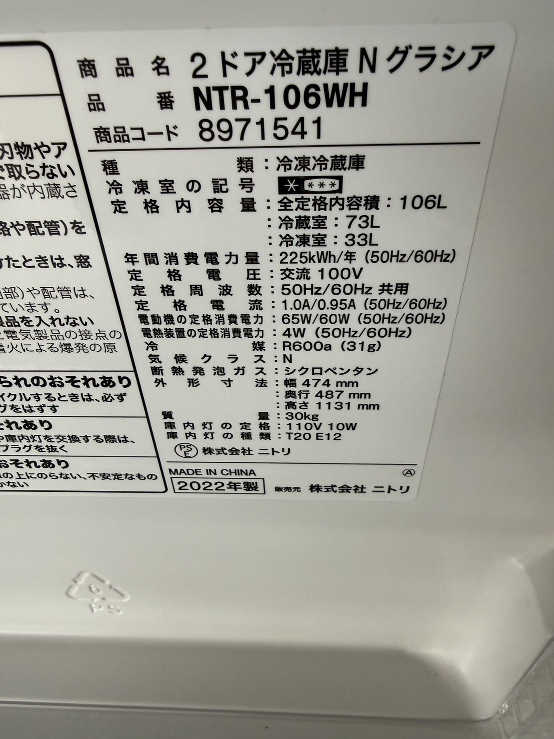 ニトリ 冷蔵庫 106L NTR-106WH 2022年製 #1892